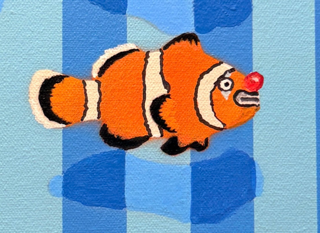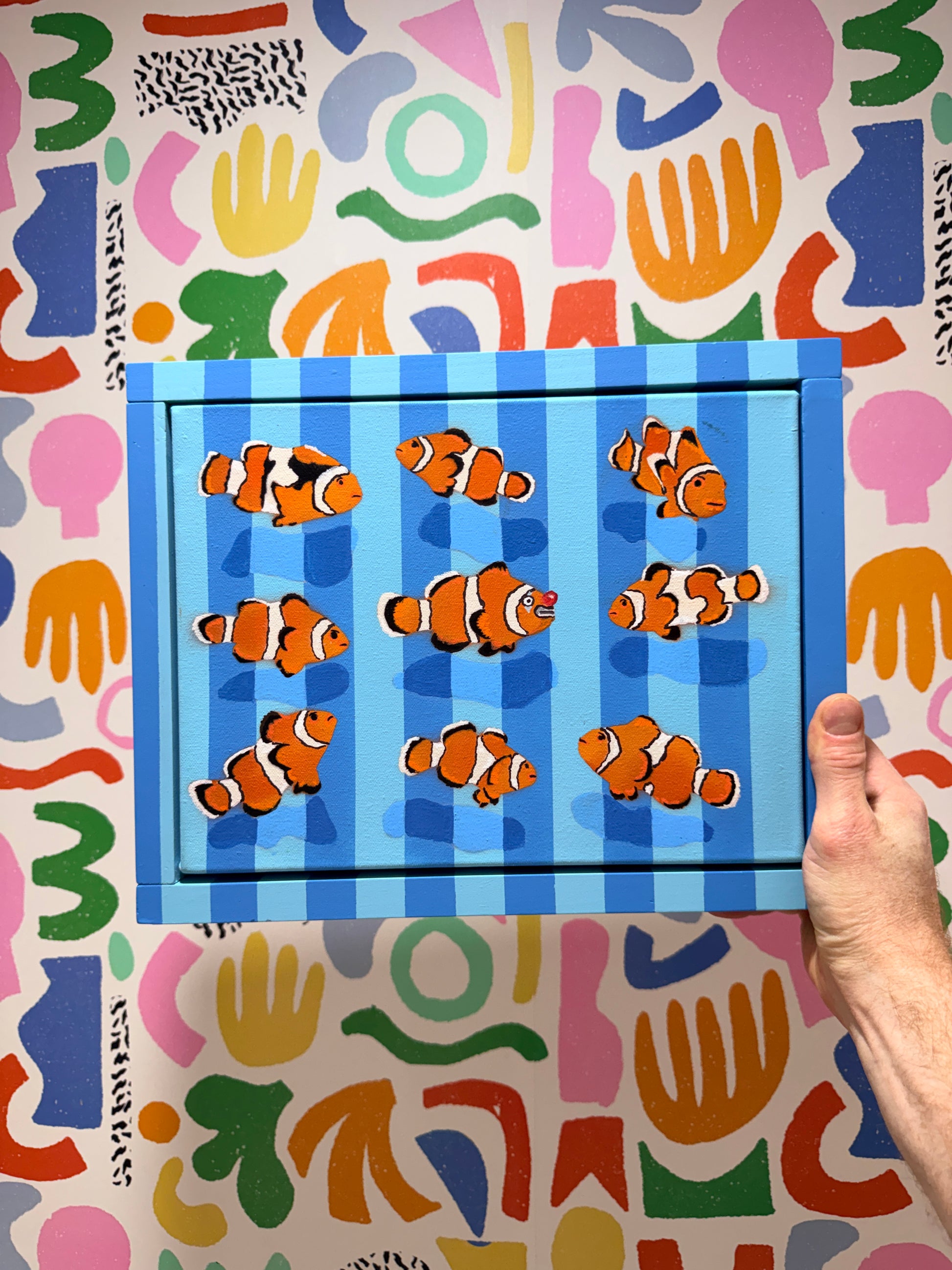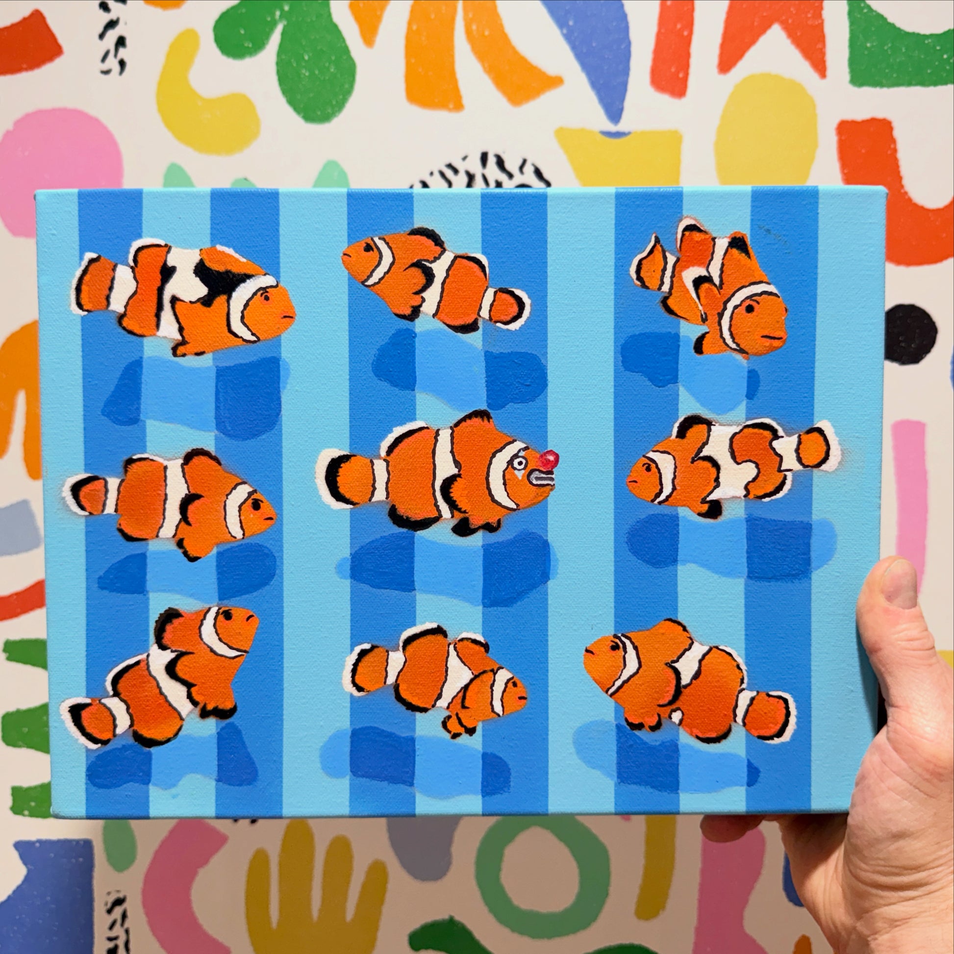 The Class Clown is a Whimsical and fun pop art piece. 9 unique clownfish swimming around the canvas. Can you spot the funny guy?