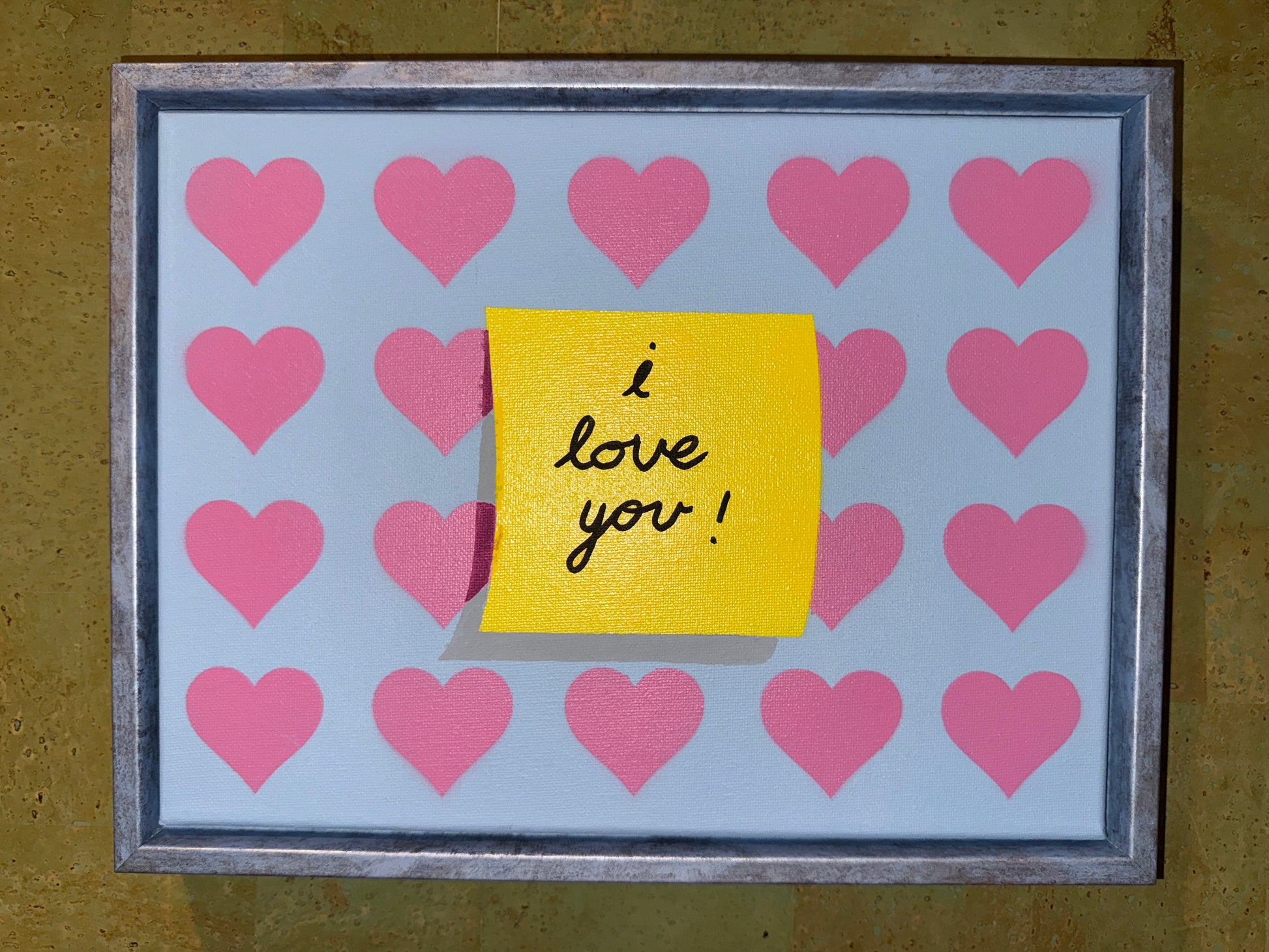 Do you heart hearts? I heart hearts. Add a touch of love to your space with this original 9 x 12 inch canvas! Spray paint and hand finishes, this piece is pure pop art. Comes framed and ready to hang. The perfect addition to any room!